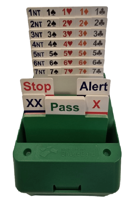 Elke biddingbox bevat een set kaarten met alle mogelijke biedingen, inclusief: